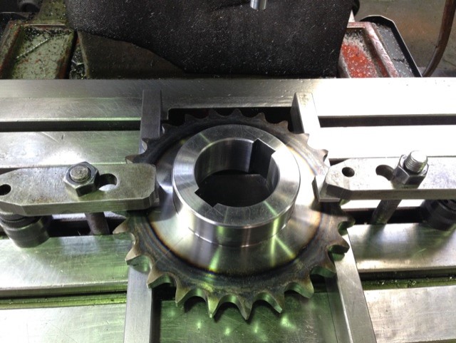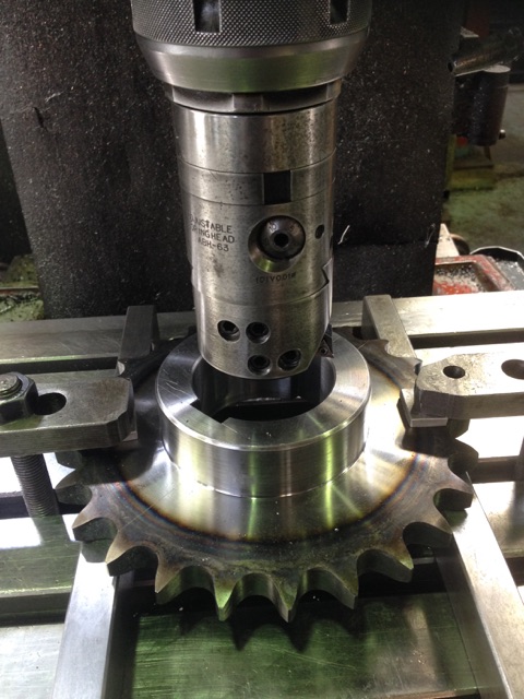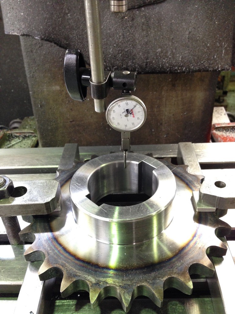 このスプロケットもダブルのキーだったので、丁寧にケガいてキー溝加工を実施しました。 刃先を焼入れしているタイプだったので、「もしかして」と思いキー溝加工後に穴径を測定。 。 。 。「やはり!」 縦と横で穴径が0.01楕円になっていました。 外側を焼入れしている肉が薄いタイプのキー溝加工は、以前に内径が楕円に変形した経験があったので、今回も可能性があると思い確認した所、案の定変形していました。 軸とのクリアランスを0.01mm~0.02mmしか取っていなかったので、この状態では軸に入りません。 そこでフライス盤にて穴径を修正することにしました。 ![]() ピックテストを使い慎重に中心を出します。 ![]() 削り代が片肉0.005mm~0.01mm!! 正確に中心が出せるかどうかがポイントになります! ![]() 丁寧に加工し、狙い通りの寸法に無事加工できました!(^^)/ 後は軸に上手く組み込めるかどうかになります(^^;) |