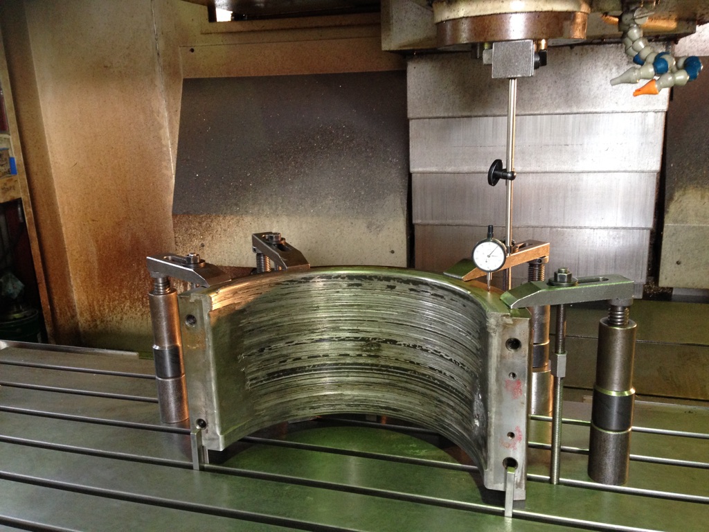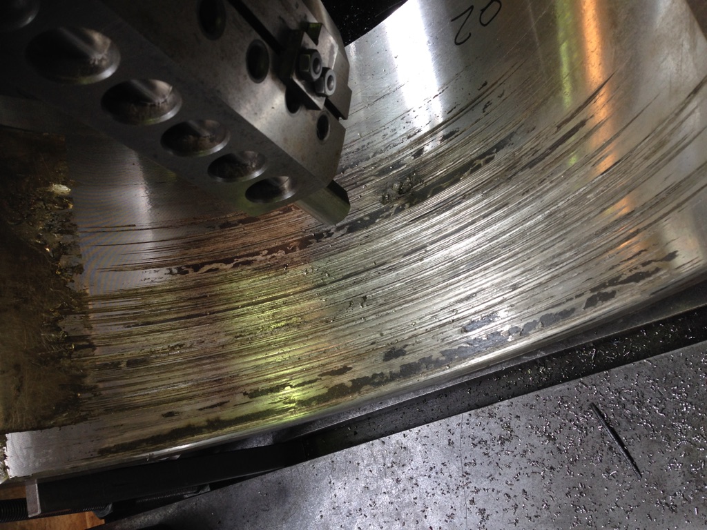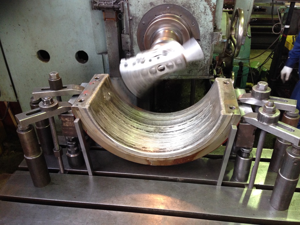 ホワイトメタル(バビットメタル)を補修する時の大事なポイントが解ったので、次は本体を肉盛り前加工します。 現物本体には、昔補修したと思われるホワイトメタルや、ゴミや、深いキズ、潤滑油のカスのようなものがまんべんなく付いている状態で、 肉盛する前にキレイに除去しておかないと補修時に不純物として出てきます。 そこでマシニングで加工除去することにしました。 マシニングにて段取り。ダイアルゲージで各部の通りをチェック。 ![]() よし!準備完了!削りましょう! ・ ・ ・ ・ あれ? 内径加工用のバイトがめちゃくちゃ重たいゾ。。。。 今回の加工はΦ480、高さ300Hもあるのでそれを削る為の工具もかなりの重量に。 マシニングの工具最大チャッキング重量が20kgまでで、今回の工具はそれを余裕で超える重さになったのでマシニングでの加工を諦めました。 「よし、ボーリング(横中ぐり盤)でいこう!」 となり、段取りする為の治具等を大急ぎで作り、ボーリングにセッティングしました。 ボーリングに段取りした所。バイトがめちゃくちゃ重たいです(^o^;) ![]() ボーリングでの加工中。慎重に削ります。 ![]() 汚れている所がキレイに取れるまで削ります。 ボーリング加工終了後はいよいよ「ホワイトメタルの肉盛り・盛り替え」です(^^)/ |