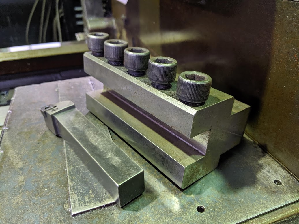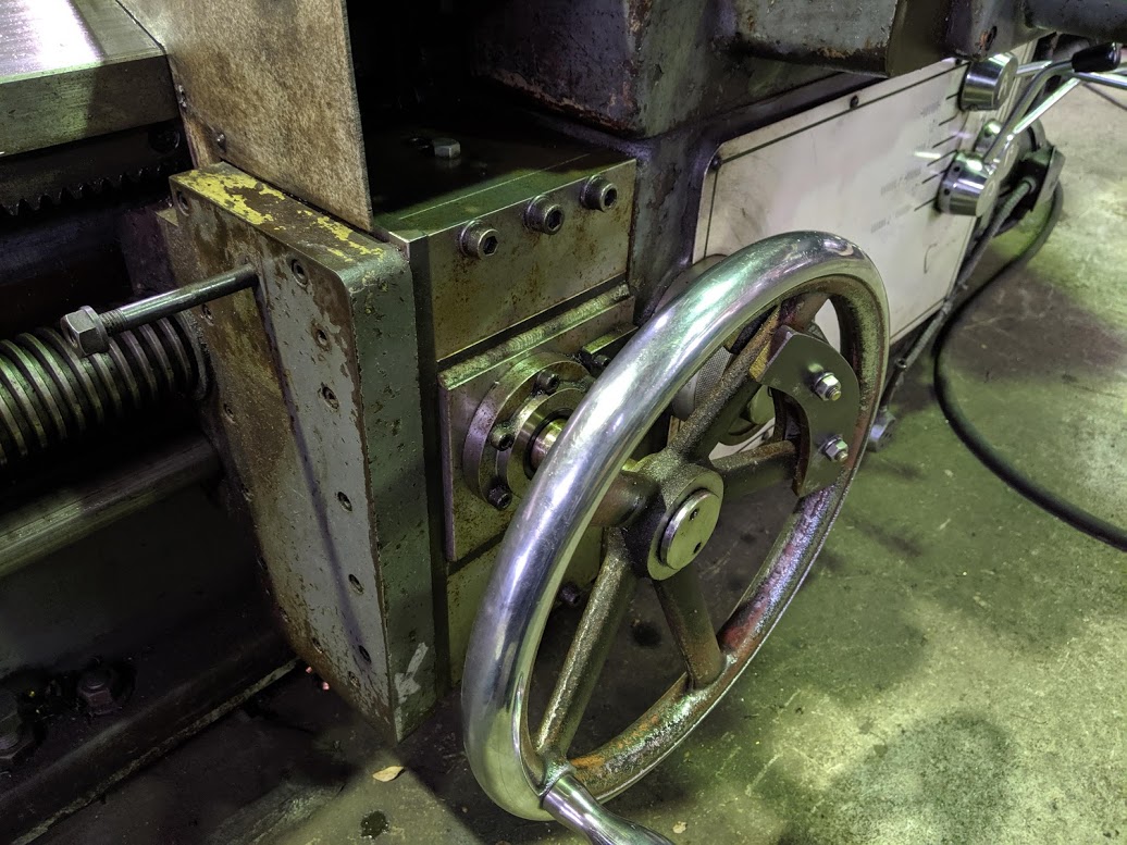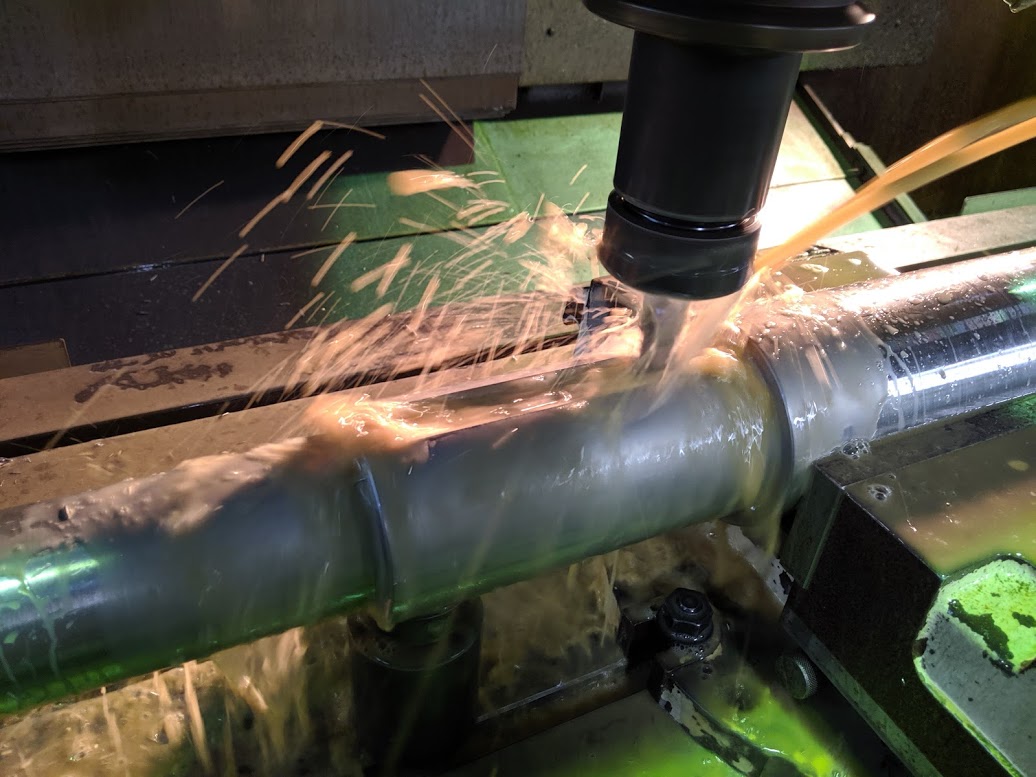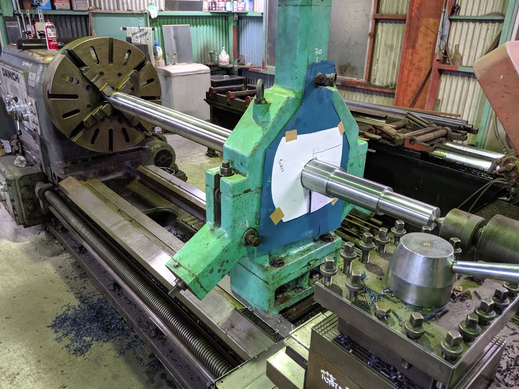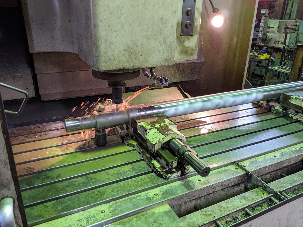 現場工事に向けて軸を準備します。 軸は長い軸:1本、短い軸:2本の計3本です。 長い軸は長さが約2.5mあるので大日の3m旋盤(DM-102-300)で加工します。 「大は小を兼ねる」の通り、普段の稼働率は低いのですがここでは3mの旋盤が活躍してくれました。 長い軸の加工。 3mの旋盤のお陰で加工できました。 ![]() この大日の3m旋盤(DM-102-300)ですが、その大きさから往復台も なかなかの重量級で、送りハンドルをとても片手では回せずに苦戦していました(^^;) そこで社長(牟田淳一氏)が歯車の間に中間歯車を新たに設置することで 小さな力でも回転できるよう設計・改造を実施。 オリジナルの中間ギアボックスを新たに設置しハンドルを回したところ、 回る!!!!\(◎o◎)/! しかもめっちゃ軽い!! と見事成功! かなり楽にハンドルを回せるようになりました。 中間歯車を設けた分、ハンドル1回転あたりの往復台の進む距離は短くなりましたが、 軽さが際立ち何も問題ありません(^^) 新しく設置したギアボックス(ハンドル根元部)。 ![]() 刃物台も大きいのでオリジナルのバイトホルダーを製作。 ![]() 会社の強みの1つでもある「設計力」、「改造力」がここでも活きました(^^)v 振れ止めを乗せての加工。 ![]() 旋盤終了後、マシニングセンターに乗せてキー溝加工。 ![]() 組んだ時、ローラーが入るところにキー溝を入れます。 ![]() ローラー、軸が出来たので続いては組み込みです! |