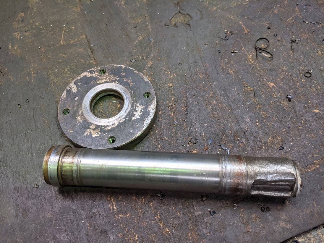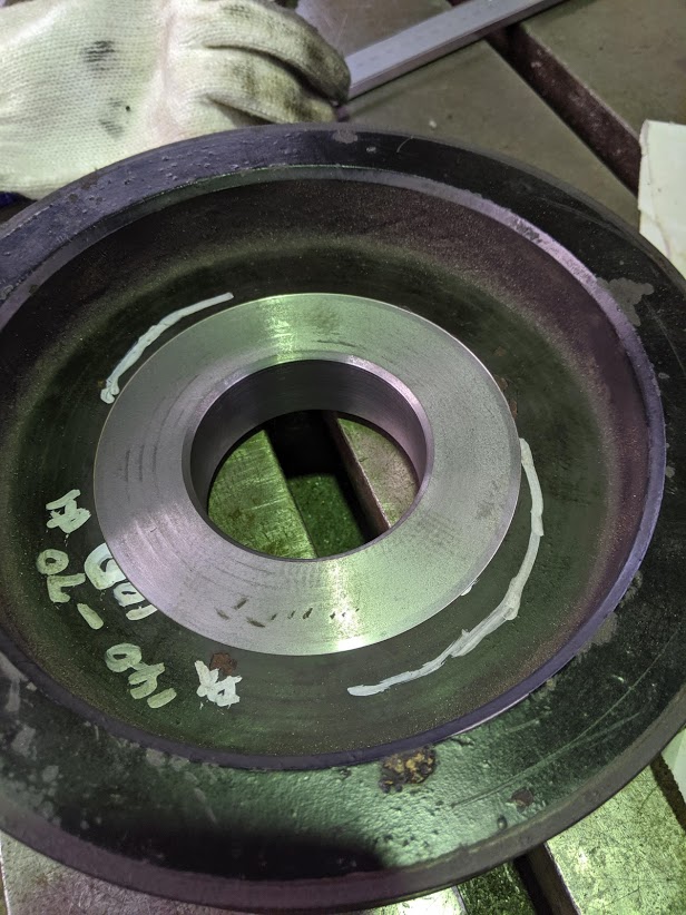 今回のプーリーと軸の修理は、両方とも現物を活かす方向で行くことに決めました。 プーリー側は、中のボス部を落として穴を大きくあけ、そこに新たなボスをしっくりした勘合で合わせてボルトで止めます。 ボス部には溶接した跡があったので覚悟はしていましたが、やはり「メチャクチャ硬かった!!」です(^o^;;) 鋳物に溶接すると硬度がハンパないくらいに上がるので、まともにはとても加工できませんが何とかボスを落とすことができました(^^;) ボス部の端面から中にかけて溶接していました。 非常に硬いです(^^;) ![]() ボス部を落とし、内径加工したところ。 一方、軸側はフランジを活かして軸を入れ替えることにしたので、溶接していた軸とフランジを取り外します。 溶接部を削り落して取り外します。 ![]() 取り外し完了です。 フランジの穴を修正して軸径をそれに合わせて行きます。 ![]() このあと現物に合わせてそれぞれを製作していきます(^^)/ |
