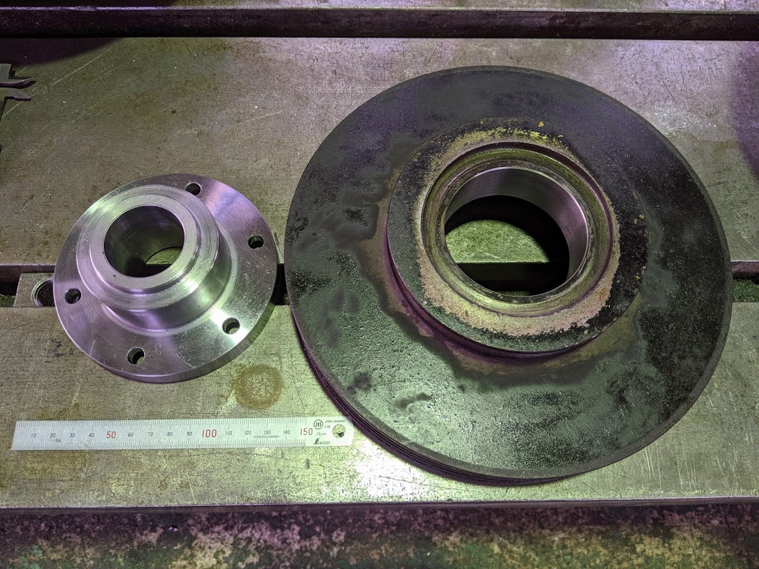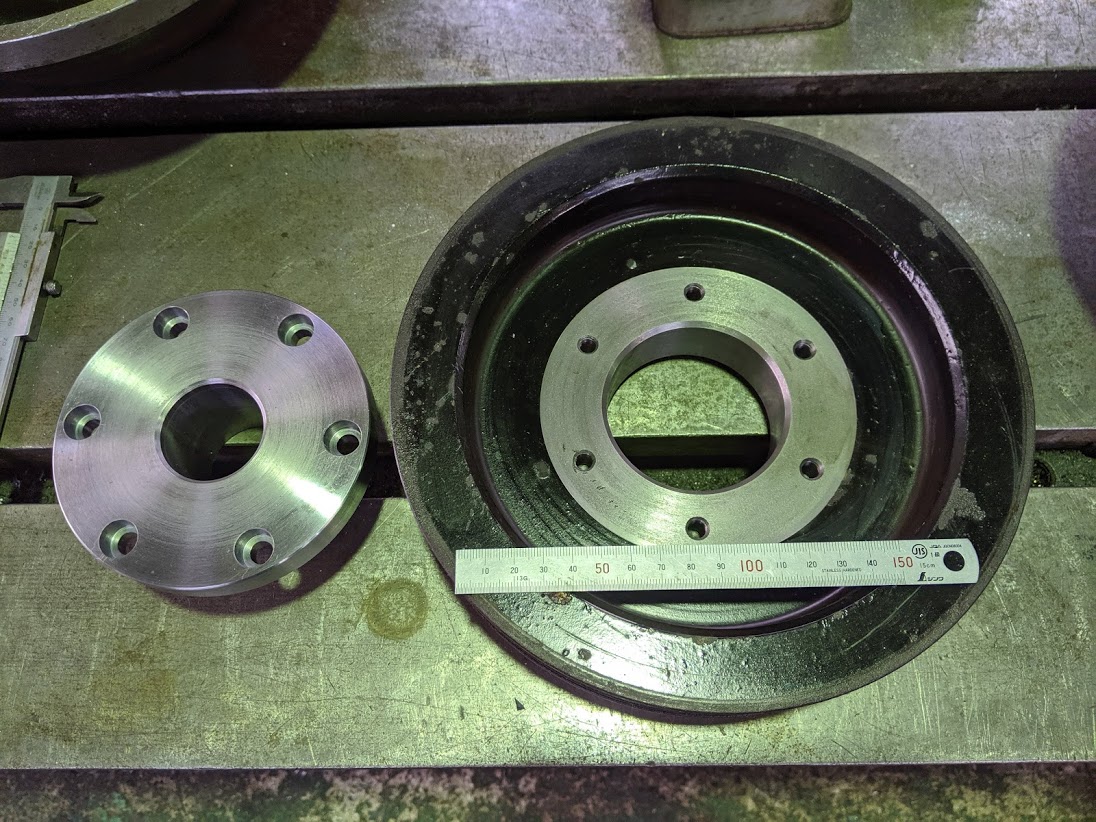 修正加工した現物に合わせてそれぞれ加工します。 プーリの本体にネジを立て、製作したボス部をそのネジで固定します。 このプーリーには使用時の荷が掛かるようなので、ボスとプーリーの勘合はシビアに見ています。 製作したボス部(左)と現物を修正したプーリー(右) 反対面。 ![]() ボスとプーリーを組んだ状態。 ![]() 反対面。 ![]() ちなみにボスの内径はまだ仕上げていません。 先に穴を仕上げてキー加工をしてプーリーと組んでもほぼ問題は無かったのですが、基本から行けば、プーリーの通りに対して穴とキー溝がきちんと出ている必要があるので、組んだ後に仕上げます。 内径を仕上げる際は、今回の修理機械の強度面から軸とのクリアランスを極力小さくしたいので、打ち込み勘合に設定します。 軸とフランジの方も同様の考えで、フランジと軸を溶接した後、フランジからきちんと通りを出して軸を加工していきます。 フランジと軸の勘合ですが、ここも強度を持たせるために打ち込み寸法にしています。 旋盤加工後にキー溝加工とタップ穴加工をします。 軸とフランジ。溶接後に仕上げ。 ![]() この後は現物を各々手入れして組み込んでいきます(^^)/ |