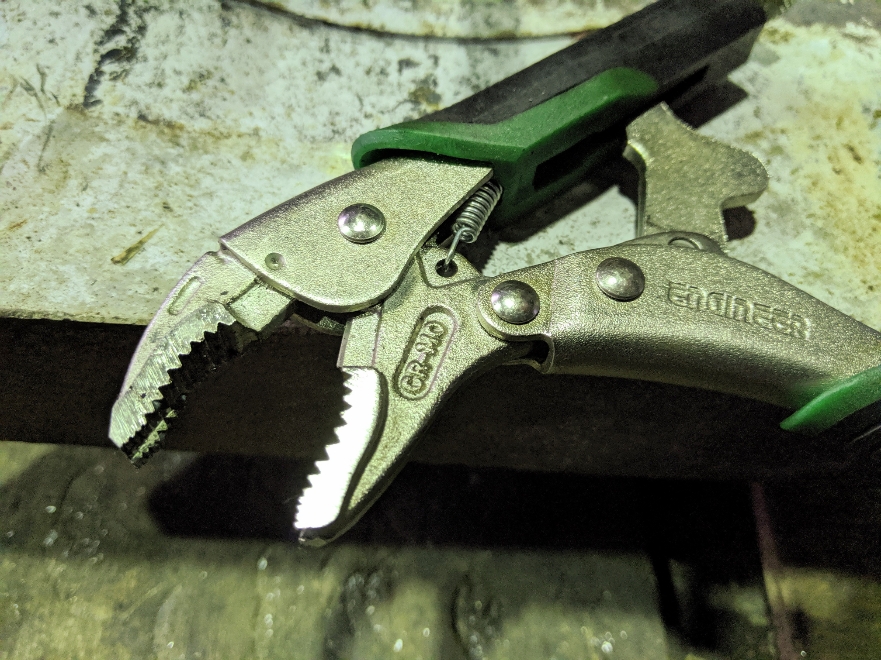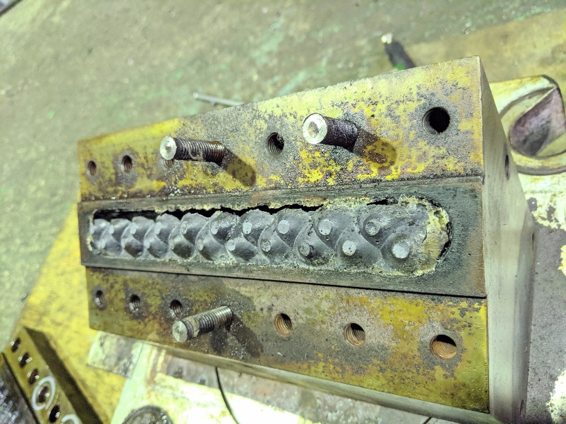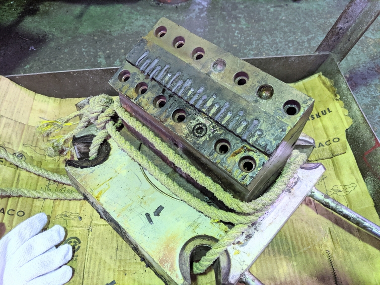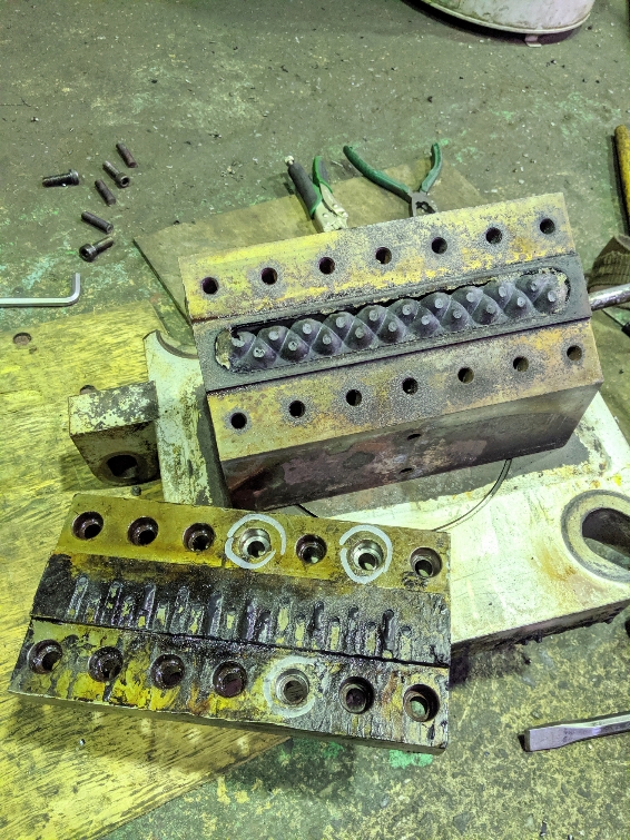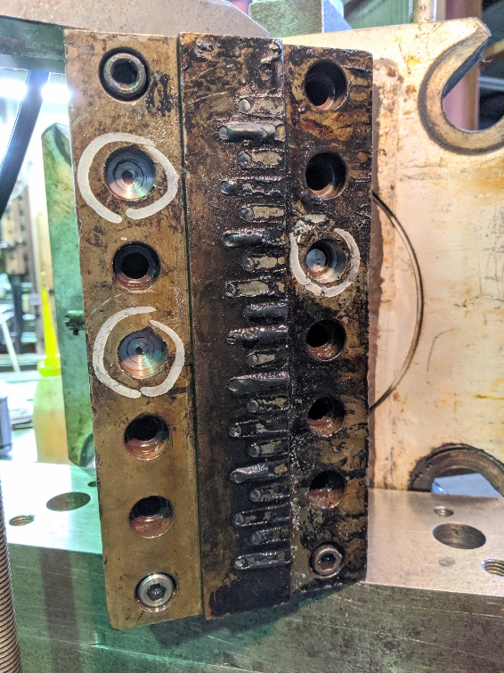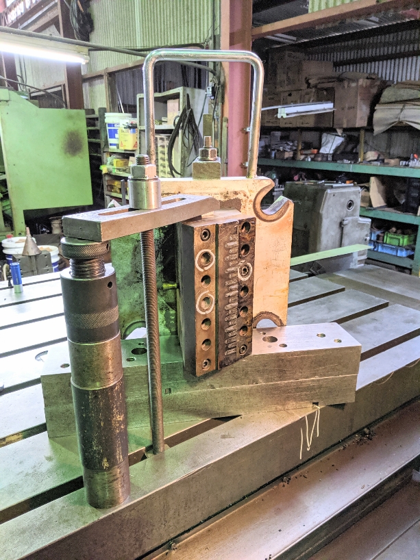 「キャップスクリュー(六角穴付きボルト)の頭が潰れてしまってボルトが外せないので今から持ち込みます!」 との連絡を昼前に受け、すぐに持って来られました。 現物を確認したところ、3本のボルトが取れずに残っていて、頭を削り落す以外に方法は無いと判断しました。 持ち込まれた現物。 ![]() 3箇所残っていて、うち2箇所はかなり掘り込んでいました(^^;) ![]() 手作業でボルト頭の削り落しは無理だったので機械にセットするのですが、斜めの面にボルトが立っていたので、段取りのし易さからボーリング(横中ぐり盤)にて加工することにしました。 ボーリング(横中ぐり盤)で段取り。 ![]() 加工を終えたところ。 ![]() ボーリングにて加工を終え、機械から降ろしてフタを外すと、残ったボルトが出ていました。 「これがすんなり取れたら良いけど・・・・」 と思いながらペンチで掴んで回すも、案の定動きません(^^;) 頭が無くなって残ったボルト。 ![]() 「こうなったら取りあえずはアレを試そう!!」 アレというのは、以前のブログでネジザウルスのことを書いた際、エンジニアさんの商品をいくつか購入したと書いていましたが、その中で、 「バイスザウルス」 という商品がありました。これが凄かった!! 「喰らいついたら離さない!」 のキャッチコピー通り、とにかくガチッ!!とクランプして力を入れても喰いついたまま滑りません。 結局そのまま力を入れて回しても滑ることなくボルトを緩めることが出来ました! 「バイスザウルス!!」 ![]() ガッチリ喰いついてます!!(^^;) ![]() バイスザウルスのお陰で無事に3本全て取れました(^o^)/ ![]() 良いアイテムに助けられたお陰で、昼から開始した作業でしたが、その日の内に納めることができました。(^^) エンジニアさんの商品はホームセンターにも色々置いてますが、面白くて良くできた商品ばかりです(^^) |