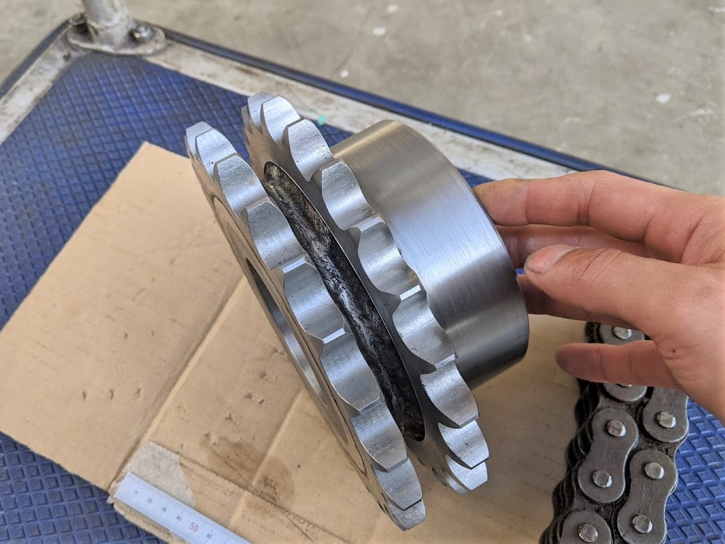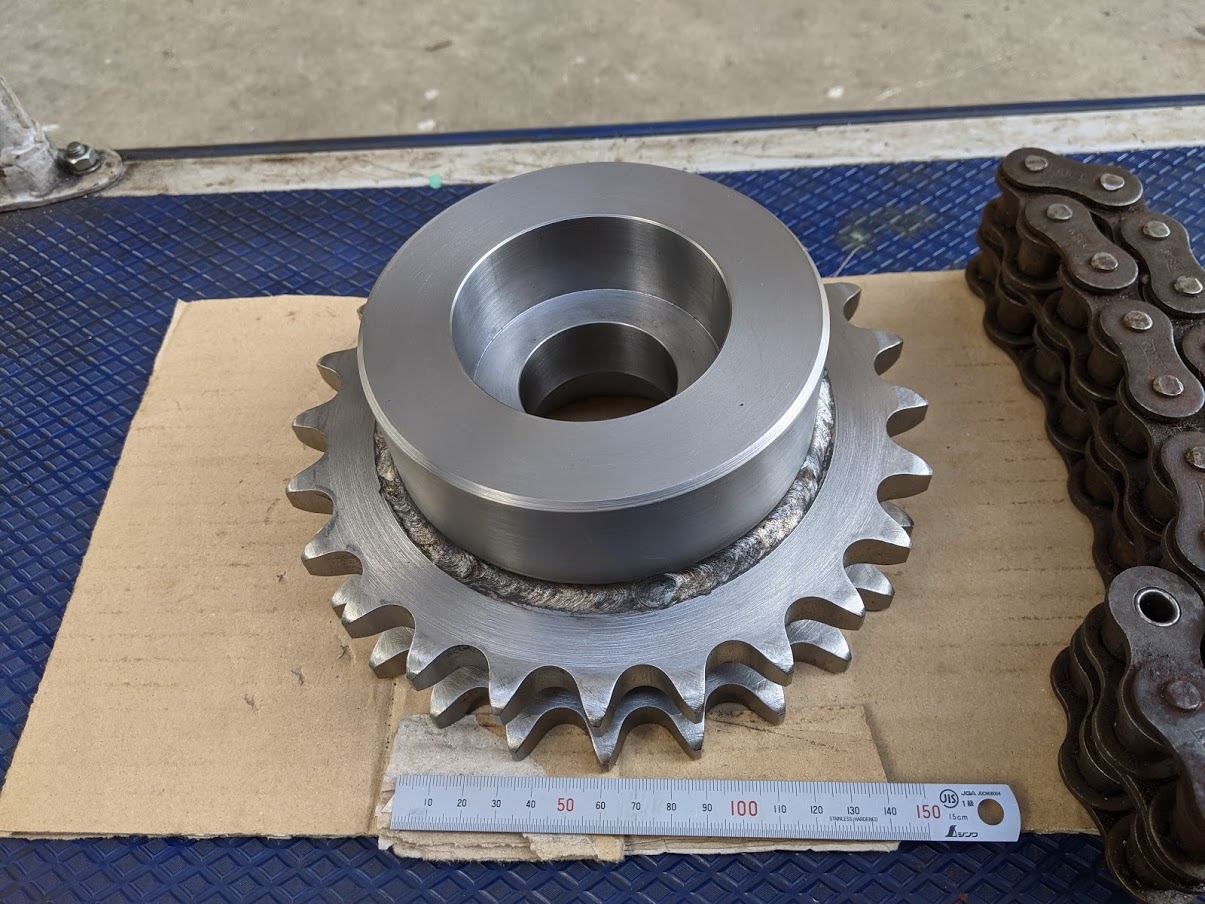 『80番の標準スプロケットの2列で特殊なB型の物を製作して欲しい』 とお客様からご注文を頂いたので加工しました。 『標準2列B型』のスプロケットは各メーカーから色々なサイズが出ているのですが、今回のタイプはボスが特殊サイズになるため特注で作るしかありません。 と言うことで、溶接構造で製作しました(^^)/ 製作した2列の特注スプロケット。 『前加工⇒溶接⇒仕上げ加工』の順番で製作。 ![]() A型をボスに2個溶接して2列にしています。 溶接時の注意点としては、『歯の通りを合わせる』です! ちゃんと2列の通りが合っているのかの確認を実際に2列用のチェーンを掛けてする必要があるのですが、過去に何かで使った時のチェーンを残しておいたものが今回模範ゲージとして役に立ちました(^^) ローラーチェーン80番の2列を通してみたところバッチリ!!でした(^^)/ ![]() チェーンがキレイに入ったのでこのスプロケットは問題なく使え、無事今回もミッションクリアとなりました! 少し変わった形状や規格の物でも対応できるよう、牟田鉄工では日頃から様々な模範ゲージを増やし続けております(^^)/ |
