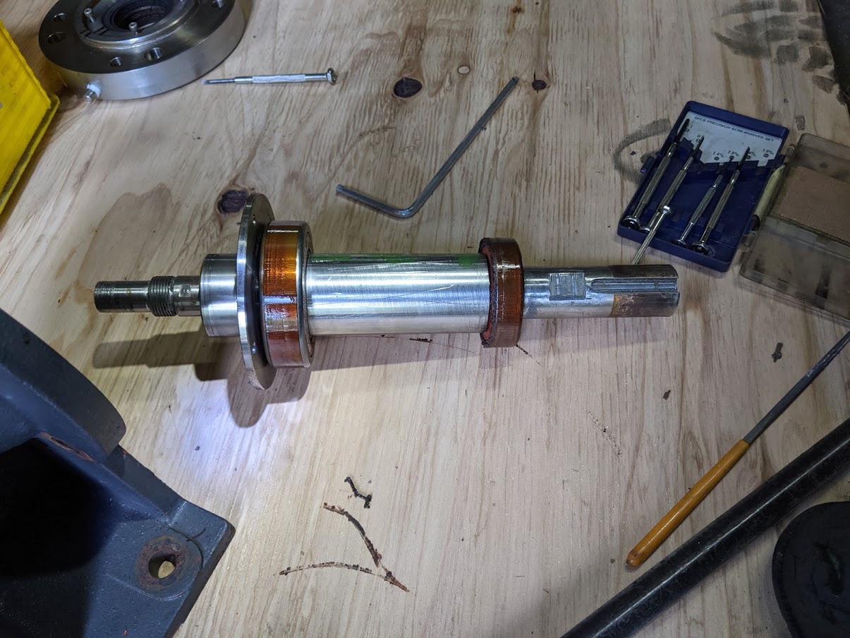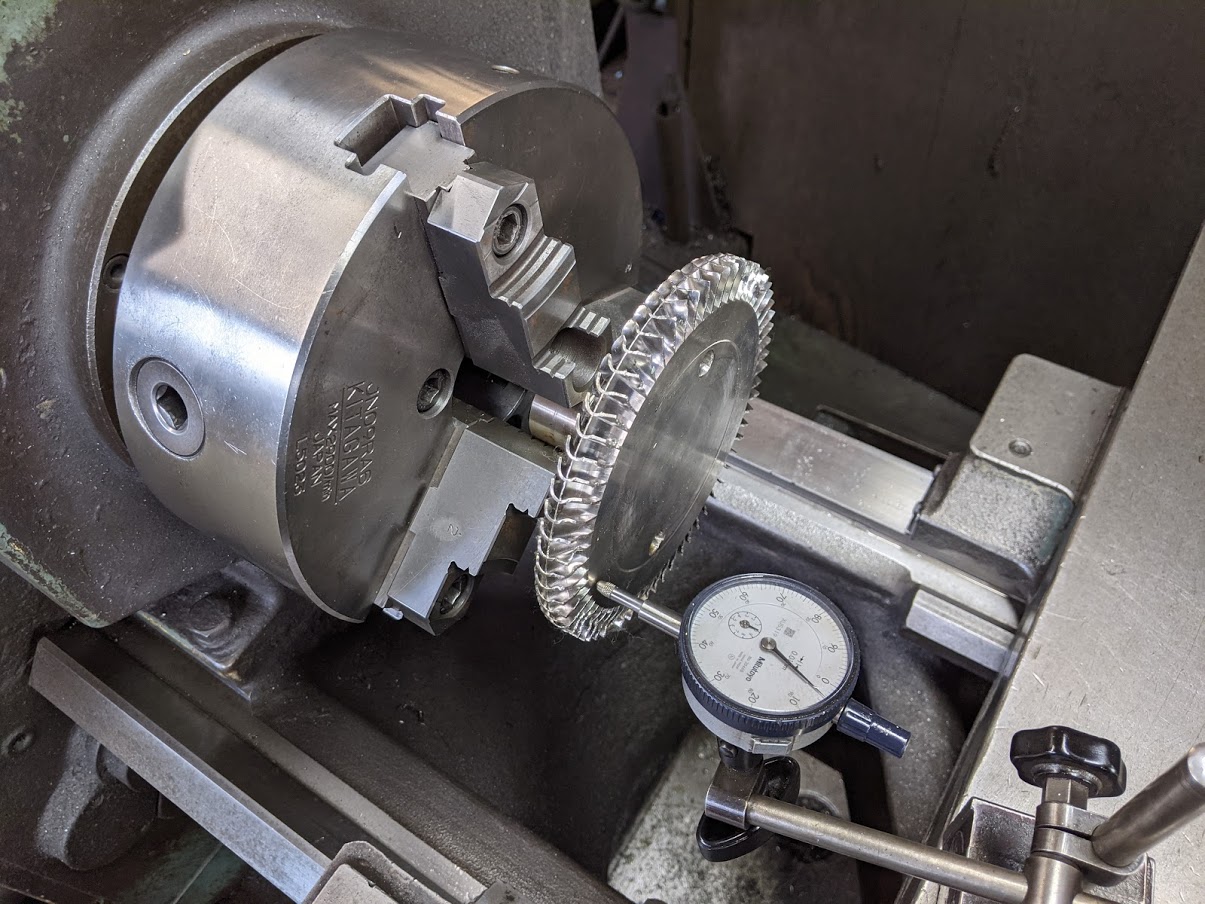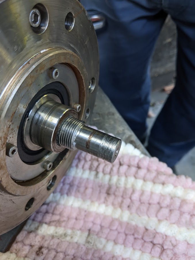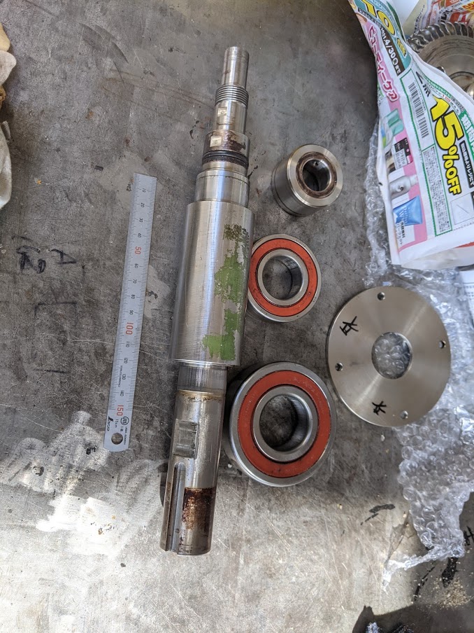 ゴールデンウイーク中、大至急でのポンプ不具合対応をさせて頂きました(^^)/ 内容は、 『ポンプをオーバーホール中、古い分と取り換えた新品の羽根が奥まで入って行かずに途中で止まって困っています!軸も曲がっているようです。早急に対応して欲しいのですが、対応可能ですか?』 というもので、お客様から5/2(日)の昼過ぎに電話を頂き、『対応可能です!』との返事をすると現物を持って来られました。 お客様が他所に問い合わせたところ、『連休明けに確認してそれからの対応になります』との回答だったようで、早急な復旧が絶対条件だった為、弊社に連絡を頂きました。 実は牟田鉄工ではこういった連休中に突発対応の依頼を頂く事はちょくちょくあり、可能な限り対応させて頂いております。 大型連休中に現場ラインが止まるタイミングで設備のオーバーホールを行うお客様も多く、その際、 何らかの問題が発生⇒突発対応が必要⇒弊社に声を掛けて頂く といった流れで、一刻も早い対応が求められる状況においてはお客様からその対応力を高く評価して頂いております(^^) 今回は食品関係の製造機械になり、ポンプが無いと製造がストップしたままで一刻も早い復旧が求められていた案件になるので急いで取り掛かりました! 持ち込まれたポンプ。 軸受部(右)と吸込み・吐出部(左)になっています。 取り替えた新品の羽根が途中で止まって全く動かない状態で持ち込まれました。 ![]() この羽根を外すのにめちゃくちゃ苦労しました(^^;) 材質はステンレスで、食品関係なので恐らく『SUS316L』だと思われます。 ステンレスは”かじれ易い”上にポンプの中が全く見えないので内部の構造を色々推測しつつ、かじれにも常に気を付けながら様々な方法を試してどうにか無事に取り外す事に成功しました(^^)/ 外してしまえば、『なるほどね。そういう事ね。』となるのですが、何も情報が無い状態では頭フル回転で対応するしかありません(^^;) 何とか外せたポンプの羽根。 軸端が入る部分が傷んでいました。 ![]() ポンプの軸端。外径が傷んでいます。 また、ダイヤルゲージを当てて軸の振れ検査をしたところ振れていました。 ![]() 軸が傷んでいる上にポンプ稼働中は軸が高速回転するので振れは厳禁であるため、新規に軸を製作する事になりました。 一先ずこの状態まで分解完了。 とにかく羽根が外せなかったという事で、復旧に向けて一歩前進です! ![]() 軸を新作することが決まったので、翌日更に分解して行きました。 減速機側に付くカップリングを分解。 プーリー抜きを使って取り外します。 ![]() また、羽根自体に振れが無かったのかの確認作業を旋盤上にて実施。 結果は古い羽根も新品の羽根も振れはありませんでした(^^) 羽根の振れ検査を旋盤上でダイヤルゲージを使って実施。 ![]() 取り外した軸に付いていたカラーやベアリングを取り外すのですが、このベアリングが結構効いてました(^^;) 軸に取り付けられている付属品を取り外します。 ![]() 軸の分解を終えると、軸のスケッチに取り掛かります。 軸の形状と加工精度や構造から設計者の意図を読みつつ、現物と全く同じに製作できるように丁寧に寸法を取っていきます。 完全に分解できた軸。 これを丁寧にスケッチします。 ![]() スケッチを終えると連休中の対応としては一先ずここまでになります。材料屋さんが休みの為です(^^;) 急いではいますがこればかりはどうしようもありません。 普段使う材質のものであれば弊社で色々とストックをしているのですぐに加工に取り掛かれますが、今回の様に特殊な材質(SUS316L)だと新規で手配するしかありません。 ※スケッチをしている時にお客様から正式に、『材質はSUS316Lでお願いします』との連絡を頂きました。 連休明けに速攻で材料屋さんに材料を頼み、すぐに入手できるよう祈りつつ(近くに無ければ大阪送りになるので一気に納期が掛かってしまいます)、入荷後の臨戦態勢に入ります(^^)/ |