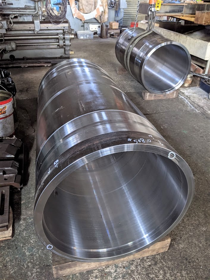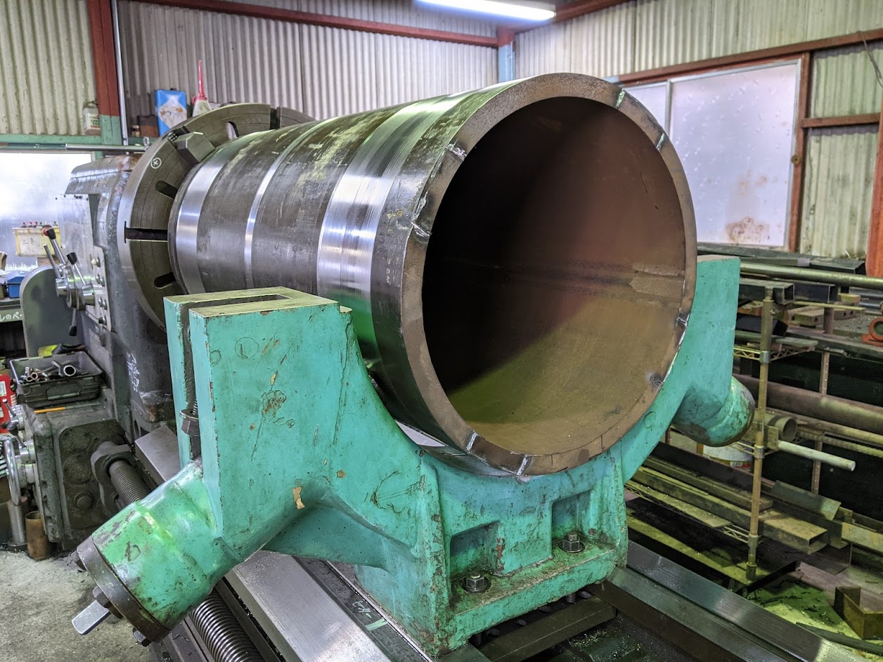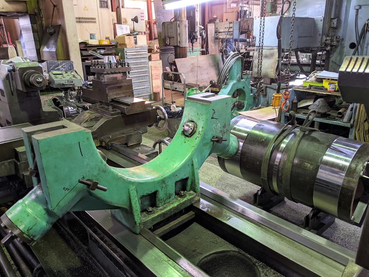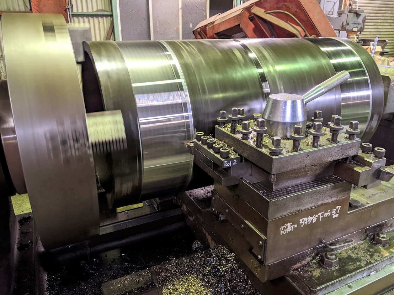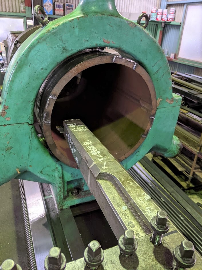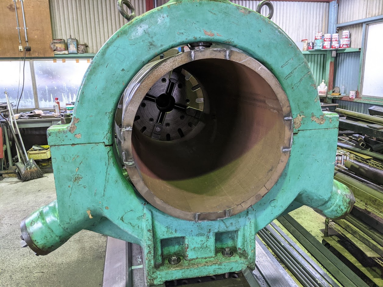 以前にブログで紹介した『振れ止めを大型用に改造!』が遂に初陣となりました(^^)/ 大径パイプを加工する為に振れ止めを改造したのですが、そのパイプが入ってきたので振れ止めを使って前加工して行きます! 入荷したパイプ。 外径約Φ560mm、長さ1m以上。 重量は約500kgもあります(^^;) ![]() 旋盤で振れ止め用&芯出し用の加工を実施。 ![]() そしていよいよ振れ止めの登場です(^^) 振れ止めの下側を旋盤に段取り。 ローラーは加工したパイプ径に先に合わせておきます。 ![]() パイプを振れ止めにセット! 大きいですね(^^;) ![]() 上の枠も取り付けて段取り完了です。 結構ギリギリですが無事にパイプをセットする事ができました。 ![]() この状態で内径を加工して行きます! 大きな品物は全部が大きくなり、 内径加工用のバイト(馬力)もかなり大きいです(^^;) ![]() 前加工無事完了! 振れ止めは全く問題無くスムーズに動いてくれました。 安定感もバッチリでした! ![]() 流石にパイプ外径がΦ600クラスになると手が出ません(振れ止めMAXΦ580程度なので)が、今回は改造した振れ止めが活躍してくれて良かったです(^^) |