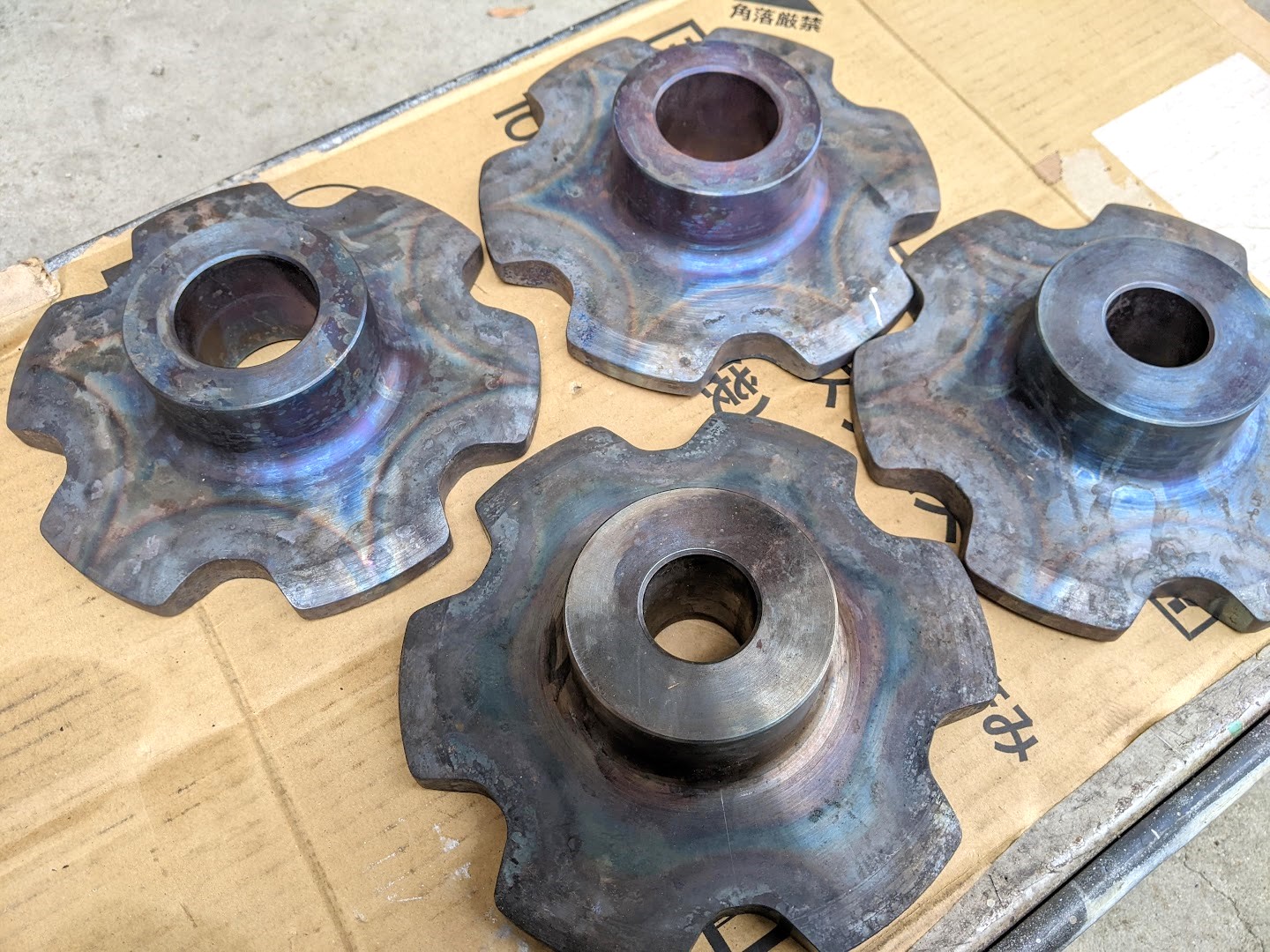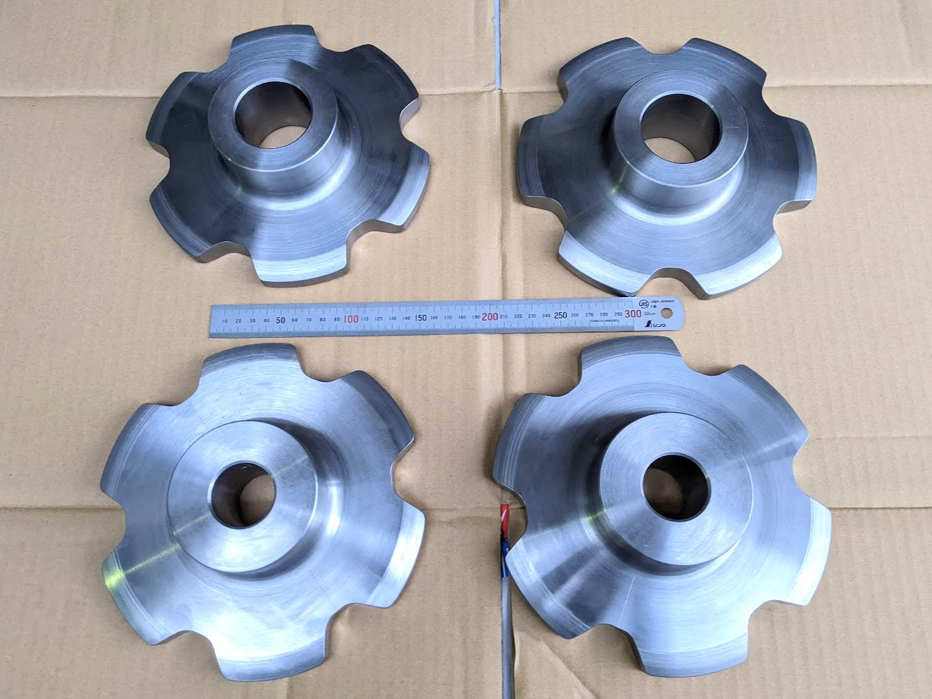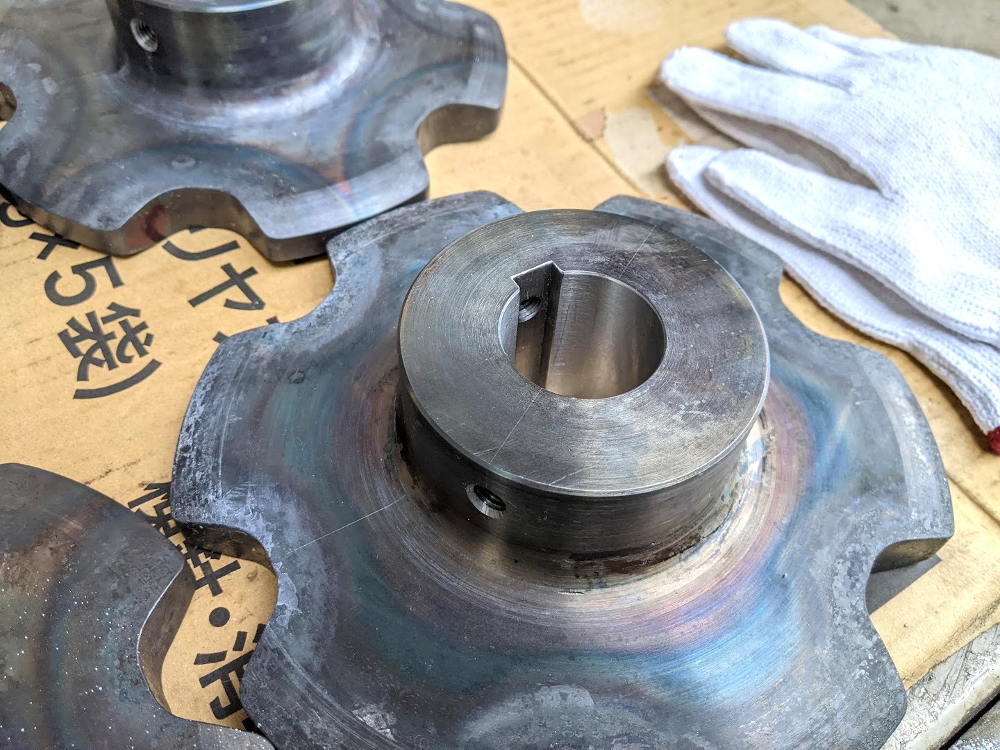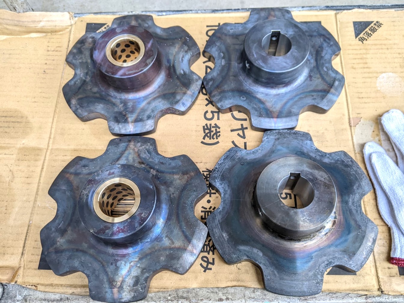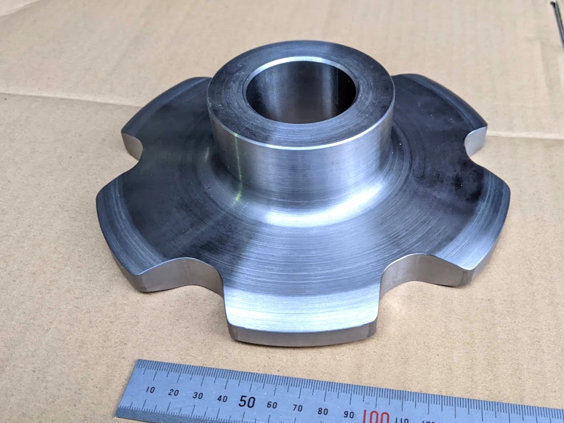 お客様からコンベアスプロケットの製作依頼を頂いたのですが、指定サイズの型番がメーカー品はどのメーカーも既に廃盤になっていた為、手配するには相当な納期がかかることが分かりました(^^;) これではとてもお客様の納期に間に合いません。。。 そこでどうするか考えた結果、 『イチから削り出しで作ろう!(^^)』 との結論になった(とゆーよりもそれしか選択肢が無かったです(^^;))ので色々と詳しく調べて加工寸法を決定し、 ・丸鋼から旋盤加工 ・マシニングセンターで歯の加工 ・歯面を高周波焼入れ ・内径仕上げ ・キー溝&タップ加工、と、オイレス圧入 の工程で加工を行いました(^^)/ 高周波焼入れ前の形状。 旋盤とマシニングでこの形状に加工。 ![]() 良い感じです! ちゃんとコンベアスプロケットになってます(^^) ![]() 旋盤加工終了時点ではまだ単純なカタチをしていてスプロケットには見えませんでしたが、マシニングで歯の溝ができた途端にコンベアスプロケットに進化しました(^^)/ この状態で熱処理屋さんに歯面の高周波焼入れをしてもらい、数日後高周波焼入れから無事に戻って来ました。 高周波焼入れから帰って来た状態。 歯面にしっかり焼きが入って硬度が上がっていました(^^) ![]() 内径のみ仕上げずに焼入れに出したので、ここから旋盤で内径を仕上げて、キー溝とタップがある分はその加工を、オイレスを圧入する分はオイレス圧入をそれぞれ実施。 その結果・・・ 完全削り出しのコンベアスプロケット、完成です!!(^^) ![]() キー溝とセットボルトがあるタイプ。 内径・キー溝共に仕上り寸法はバッチリです! ![]() オイレスを圧入するタイプ。 圧入する際の効き代を決め、オイレスの外径から穴径を決定。 その後圧入! ![]() こちらもかなり良い感じで圧入できました! 今回初めて丸鋼からの削り出しで製作したのでどんな感じに仕上がるか楽しみでしたが、思ってた以上に良い感じに出来上がりました(^^) ちなみに元々の図面はA型のスプロケットにボスを溶接する構造になっていたので強度面の点からも丸鋼一体物の今回の方式はより強いと思われます(^^) 完成後、無事にお客様に納品するができました! こんな感じで2023年は色々と予定通りに納品が済み、大きなトラブル無く無事1年を終えることができました(^^) また、職人さんの新たな成長が見られたり、新規取引先が増えたりと恵まれた一年間になりました。 2024年も様々なお客様のご要望にお応えできるよう、従業員一丸となって精一杯頑張って参ります(^^) |