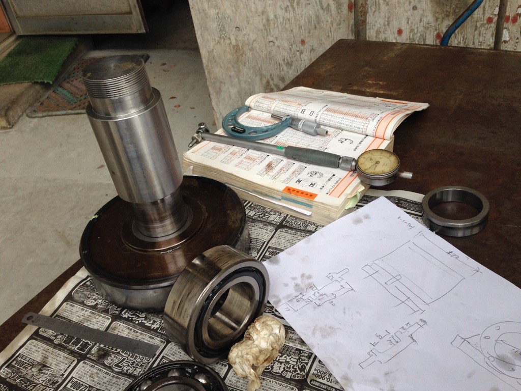 との依頼がお客様からあり、現場の工場へ。 仕事内容的には、 ・ケースを止めているM16のボルト4ヶ所外す ・ケース内のベアリングを入れ替える という通常よくある内容だったのですが、ボルトを取り付けている場所がかなり入り組んでいてボルトがなかなか取れずに悪戦苦闘しました(^^;) 外したケースを持ち帰り、汚れをキレイに取って分解し現状寸法を確認します。 ローラーとケース内の軸・ベアリング。 ![]() ケース。 ![]() 各寸法を測定すると、ベアリング(特殊なベアリング使用)の他にも軸の摩耗やローラー内径のガタ、ケース内のスリーブ有無等の問題が出たのでお客様に伝えたところ、製作・修正お願いしますとのこと。 また、工場を何日も止められないので早めに復旧したいと言われていたので、大至急製作となりました。 早急にスケッチして図面を描き、早期復旧に努めます(^^)/ |